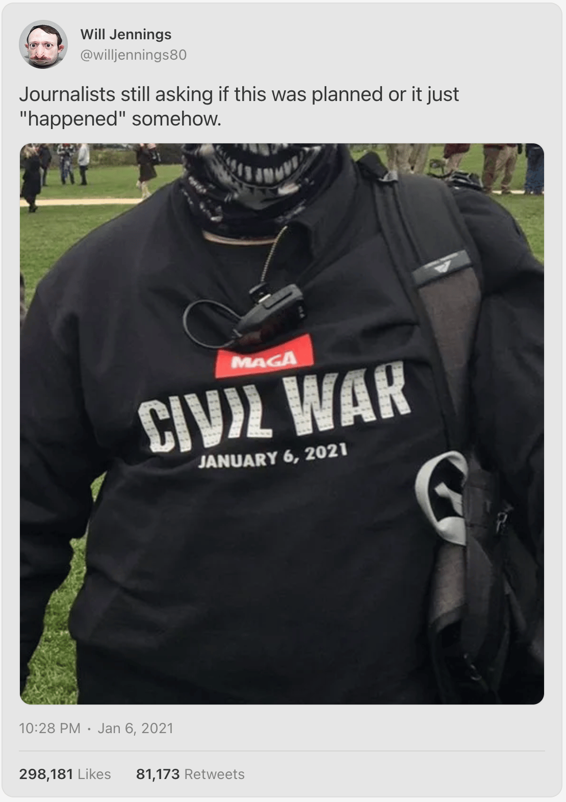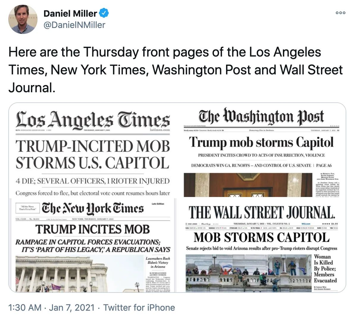 As always with American political news, the clearest and least self-deluded coverage tends to be British. Robert Moore at iTV turned in the most harrowing and comprehensive seven minutes I have seen. If you'd prefer print, The Guardian's Julian Borger also covered it well. If you need an enormous amount of raw footage, here's a large and growing archive (click the "Capitol Hill Riots" link and then "Tree View").
