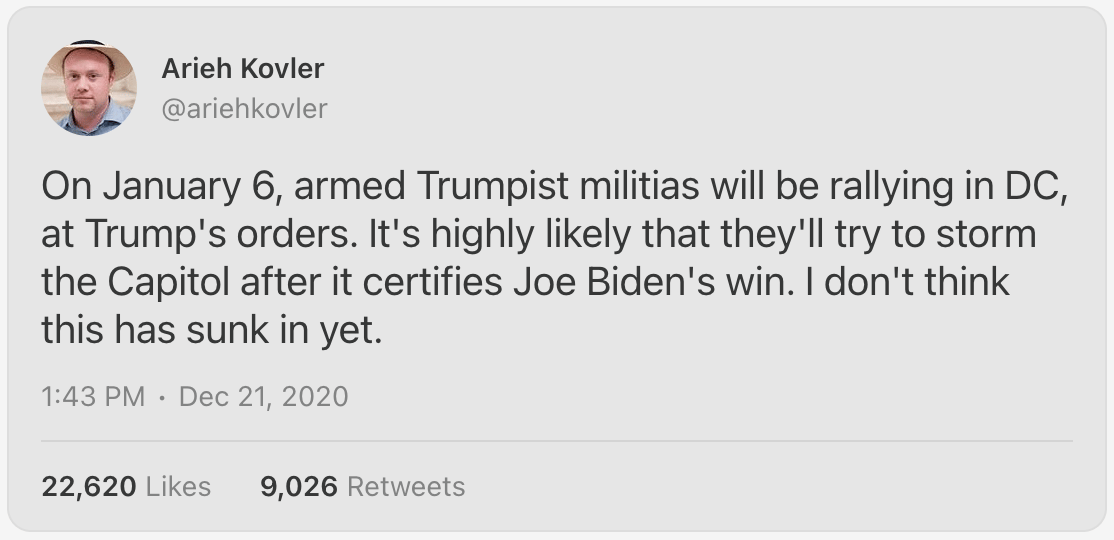 Jane Lytvynenko and Molly Hensley-Clancy, who chronicled the weeks of open online planning that preceded this attack. The online planning continues right now, by the way, in case you think it's over.