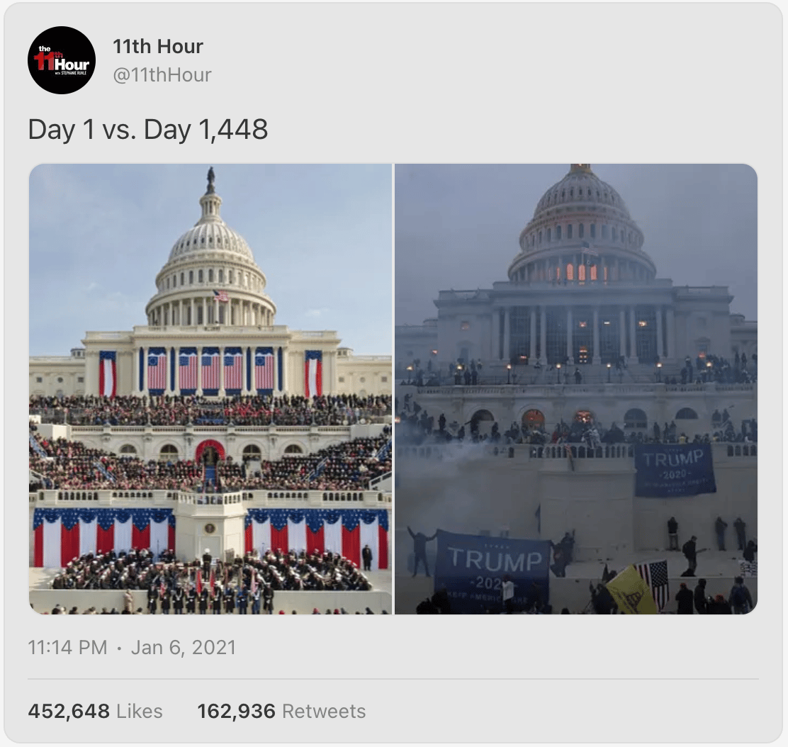 Ryan Mac reports on the internal discussions at Facebook, which managed to craft a response for its advertisers long before eventually deciding that instigating a coup constituted "two policy violations" and locking Trump’s account for 24 hours. This morning Mark Zuckerberg announced Facebook is now locking the accounts "indefinitely." Twitter locked Trump's account for 12 hours after he removes three tweets that were finally too coup-y even for Jack, and threatened a permanent ban if he refuses to namasté. As of press time Trump hasn't tweeted since yesterday.