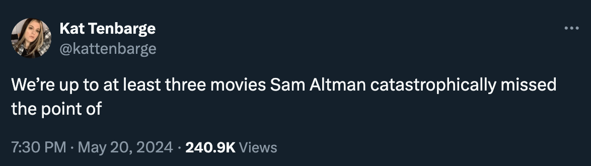 Recapping the imbroglio,1 Casey Newton wrote that Sam Altman is full of shit [measured, respectful] and Ed Zitron wrote that Sam Altman is full of shit [angry diatribe]. But with the final departure of co-founder and actual technologist Ilya Sutskever, whose last-ditch effort to oust Altman failed last fall, OpenAI is now firmly under the control of Paul Graham / Marc Andreessen style technofascist incompetents, and this kind of clown show will increasingly be the norm.