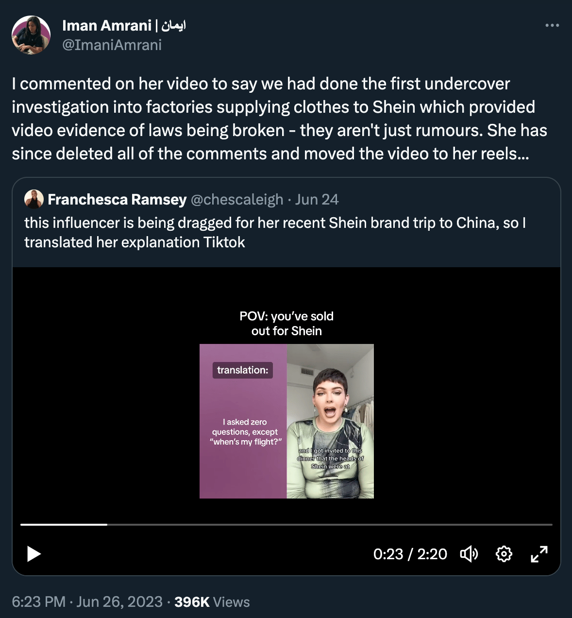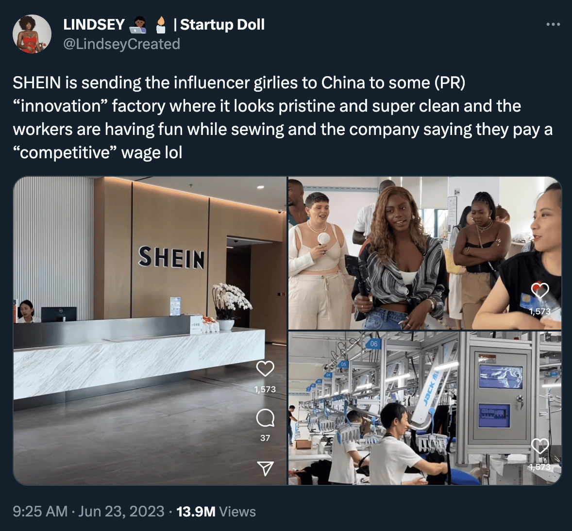 The other five CONfidence Activists employed eerily similar language, suggestive of a Shein-provided form letter: “Like many others, I’ve heard a lot of misinformation,” said Marina Saavedra. “I expected this facility to be so filled with people just slaving away…they weren’t even sweating, we were the ones sweating,” said Destene Sudduth (the audacity!), adding workers “get a nap-time after lunch.” In a post she has since deleted Aujené insisted that “everyone we came across was content with their salary and the idea of child labor was something they looked at me crazy for.”