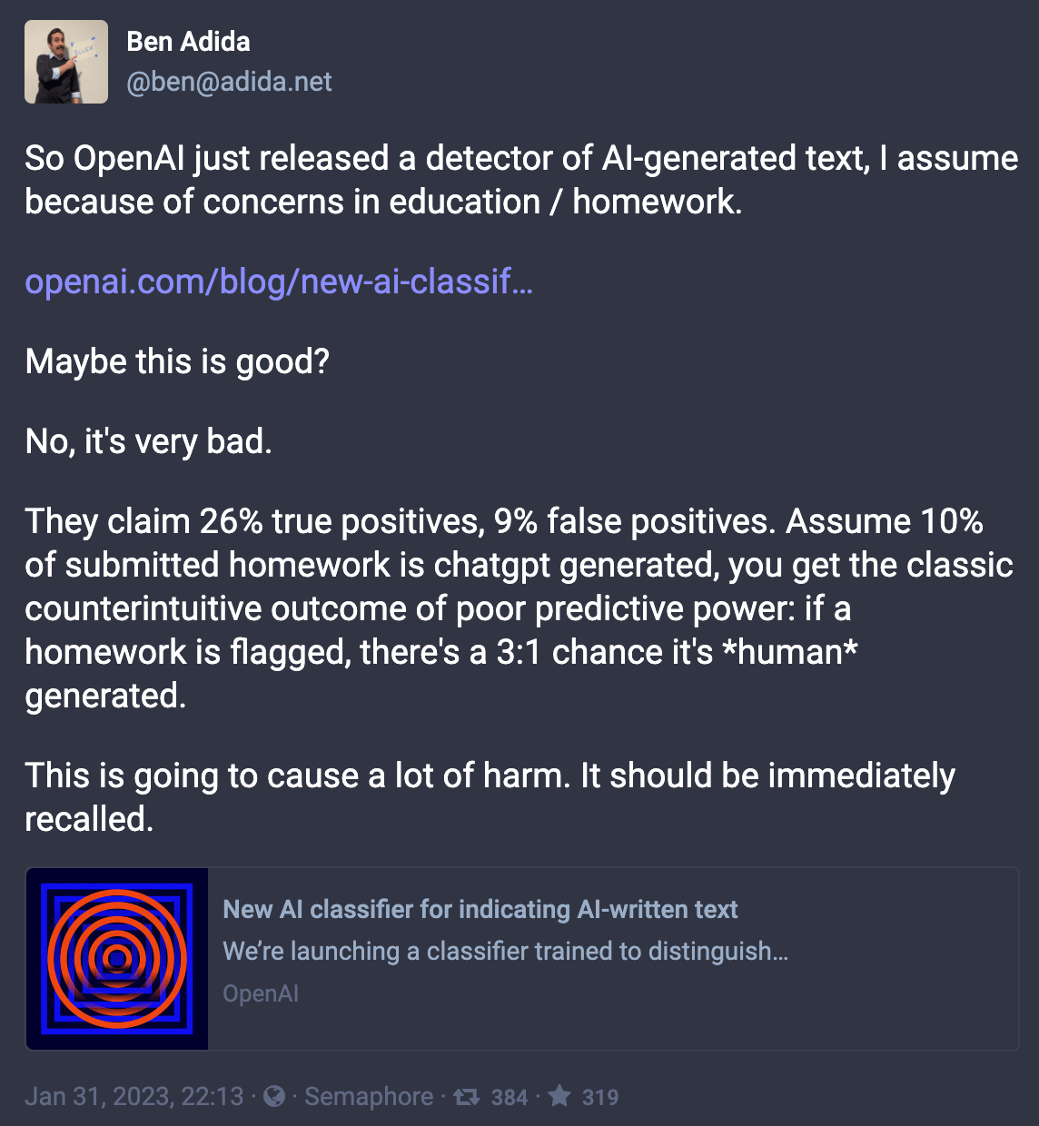But while TikTok is creating meaning from gibberish, the AI content farms are hard at work creating gibberish from meaning. OpenAI announced an “AI classifier for indicating AI-written text,” which is great right? Let the AI spot the AI-generated text and end AI-powered cheating before it even starts? Only if you let the AI do the math, as Ben Adida pointed out: