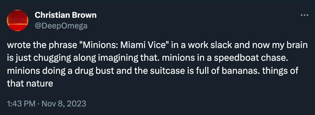 But maybe I’m not coasting. Garbage Ryan says the web is vapor now so maybe I’m just “going post-viral on the vaporweb.” Maybe I’m having a delulu moment. In The Guardian Alaina Demopoulos investigated whether “‘delulu is the solulu’ to make one’s dreams come [true-lulu]” and listen to me, are you listening: yes it is. My biggest red flag is that I one hundred percent believe in “manifesting,” or “being delulu” or whatever you want to call it, as a way to weaponize Baader-Meinhof to your advantage and be alert to opportunities that you otherwise might not have noticed. Or maybe it works by energy field resonance or *gestures vaguely at the moon*. After all, writes Demopoulos, “there is no peer-reviewed research to back up the effectiveness of a delulu moment.”