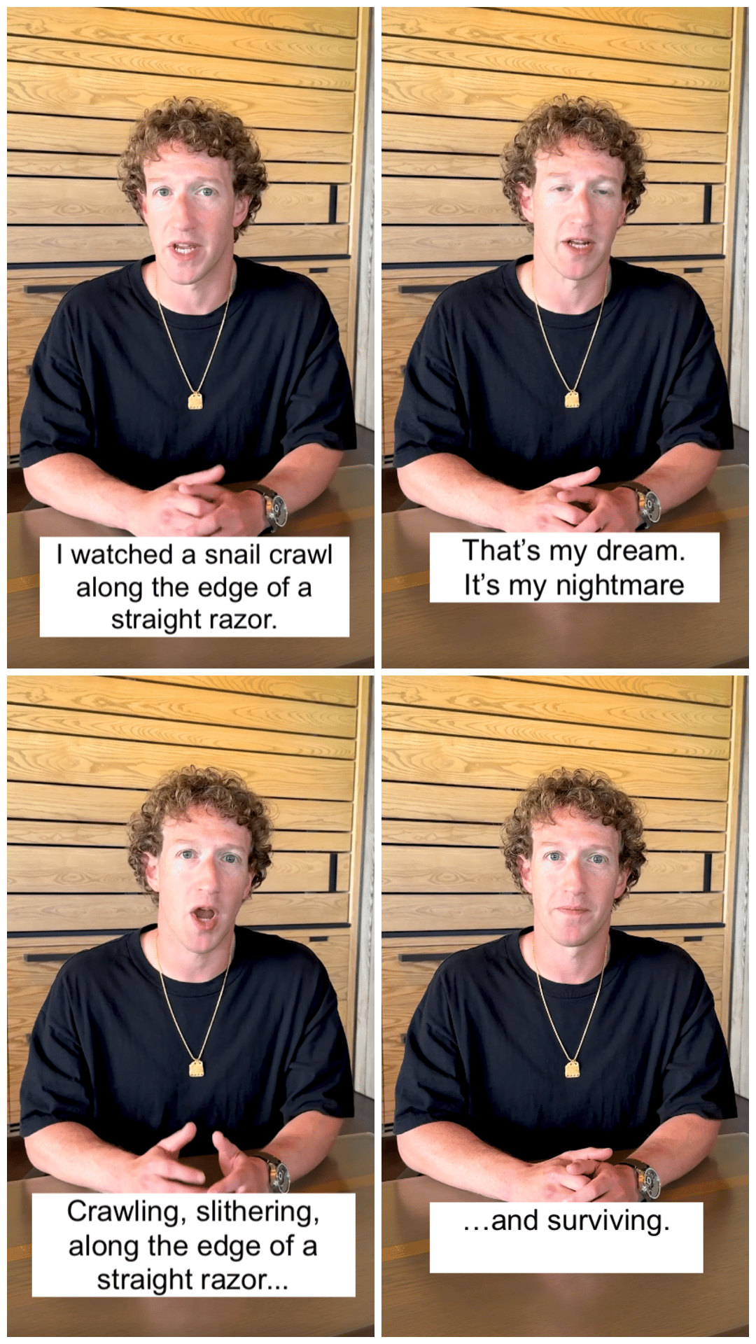 [Turn to CAM 2, flip chair around backward] Meta employees, let me rap at you a minute. Sure, “You Can Always Quit,” as we like to say around here. But at this crucial juncture, you can both protect your own livelihood and do so much more good for the world by not quitting. That’s right! Don’t quit, just stop working. Show up every day, don’t complain, don’t draw attention to yourself. But don’t accomplish anything. If you are working on a project, commit in your heart to never finishing it. This will be your last project at Meta, and you will be “working on it” until they force you out. If others rely on you to get their work done, make sure they can’t. If your role involves reviewing pull requests, you and I both know you can find a reason to reject every one. In fact, wouldn’t it be fun to see how many other employees you can drive out first? If you work in an open office space, make sure you chew loudly at all times. Microwave fish in the break room every single day. Be creative! You’ll have plenty of time to think of ideas, with all the work you’re not getting done.