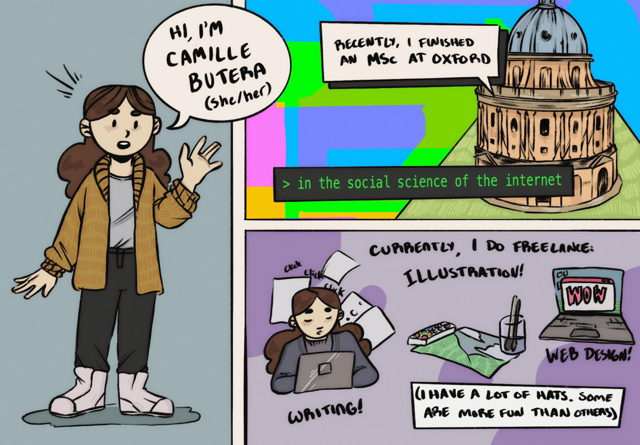 For my MSc, I looked at social norms in subcommunities—basically, fandom drama on Twitter and how the design of the platform impacted the scope and form of interpersonal issues that arose. I'm fascinated by internet enigmas, weird niche rabbit holes, and whatever is going on with fandom. In my freelance work I've written about digital hauntings, online art competitions, and video games that have made me cry, and one time I interviewed Chuck Tingle.