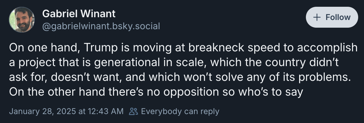 And what is the loyal opposition doing about all of these wildly illegal (and/or, separately, unconstitutional) moves? So far Senate Democrats are working speedily and aggressively to confirm Trump’s cabinet nominees, including a unanimous 99-0 vote confirming “L’il” Marco Rubio as Secretary of State. Senate minority leader Chuck Schumer (D., Citigroup) took a moment away from posting about A.I. to complain that Mr. Trump sure better knock it off or someone might have to do something. House minority leader Hakeem Jeffries (D., AIPAC) is still talking about eggs, in keeping with with the strategy NBC News’ Sahil Kapur reported yesterday: