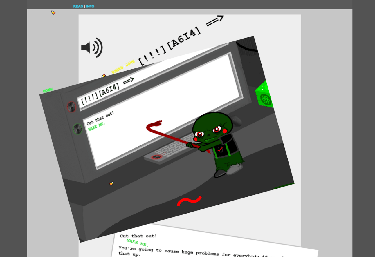 Near the middle of the podcast Homestuck Made This World, media academic Michael Lutz highlights how the Flash “[S] Cascade” does this, and why most fans can probably remember the first time they watched it. What makes Cascade memorable is that it “breaks” the website aesthetically (although it also crashed Newgrounds and MegaUpload in the process) by making the standard space of the screen expand past the established confines, after setting up the illusion that those borders were still there. To show that the world is breaking, it breaks the medium of the story itself. Or sometimes, you just get a green gremlin hitting a console with a crowbar and making the site physically shake. The story isn’t content to make the digital website a passive container, but instead makes it vital to the experience.