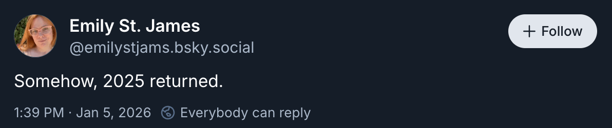 Yesterday In The Year That Was And Wasn’t: The Morning News, “The Year That Was and Wasn’t.” Category-matching web game 2025 will ruin your life for an indeterminate number of hours. Sarah Jeong closed out the year explaining that propaganda of the deed is so back. Only “media leaders” could take Semafor’s question “what did you get wrong in 2025?” as an opportunity to brag. The mayor of Shirley Jackson’s Buell, Maine got a fan-Chotining in “Why one small American town won’t stop stoning its residents to death.” And Erin Kissane wrote about the collapse of collective sense-making as “what happens when you hit a saturated jumble of communal sense with something big and fast and heavy.”