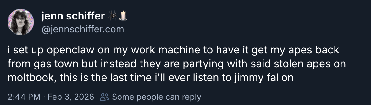It’s a short one today because I collected a ton of links about OpenClaw and then decided I don’t actually care about it, lol. Good luck to everyone turning over all their credentials to the credential stealing machine though. Ok one more thing—this guy figured out how to spend $20 to ask a computer what time it is. The innovation here is incredible.