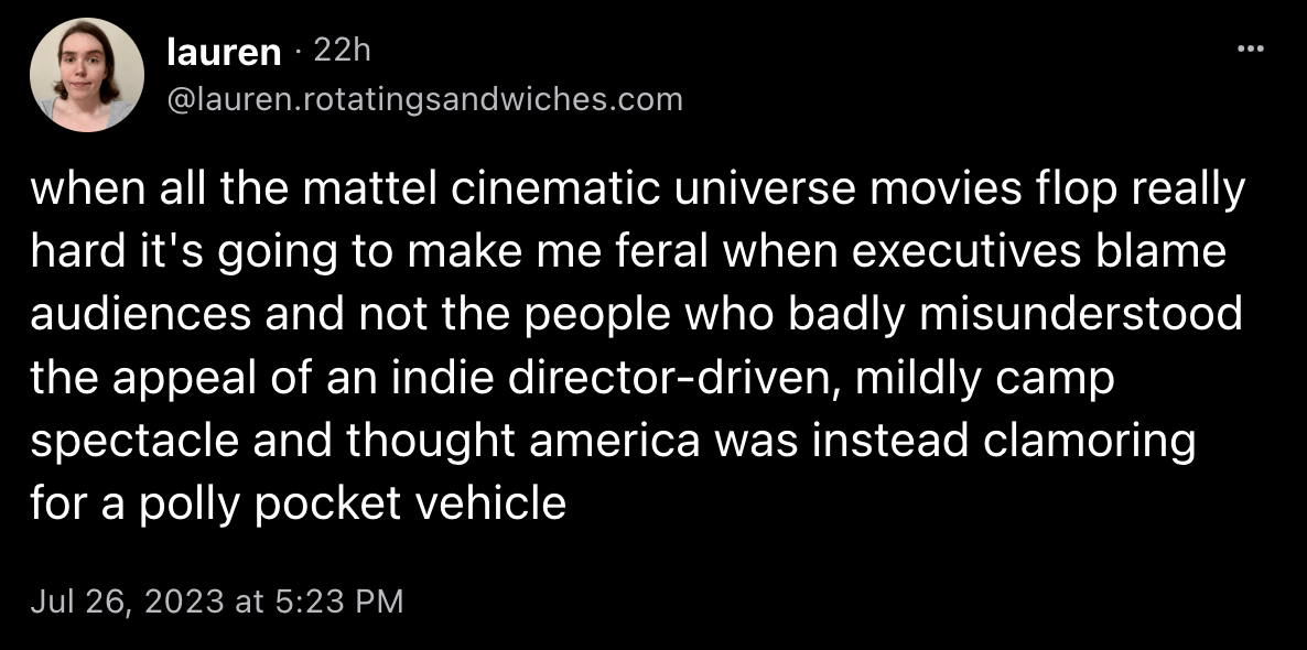 Mustard Skittles? Everybody so creative! See how you’d think the Mayor of New York shouldn’t say that? But he did! See how it probably looks like you wouldn’t want to see a Polly Pocket movie? But you’re gonna see it here! See how perfect this Jeet Heer Barbenheimer thread looks? It looks picture perfect, paint a perfect picture! So differently different! That’s what we’re going for.