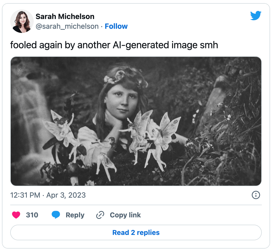 What’s the most famous pre-digital shooped pic you can think of? Perhaps Stalin’s endless visual expurgations, which have been memed to death. Tabbers of taste and discernment might also be familiar with the Cottingley Fairies, in-camera fakes using paper dolls which suckered none other than Arthur Conan Doyle, by that time a devout follower of Spiritualism and an accomplished sucker.