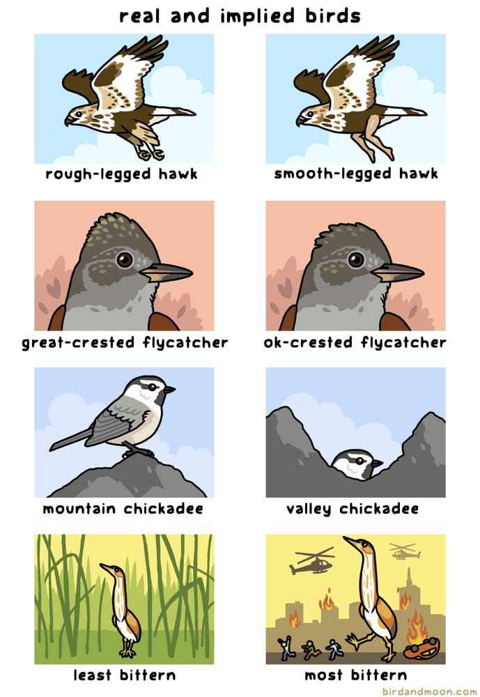 And Finally: From Rosemary Mosco: “Real and Implied Bird Species.” (Her Patreon is right here.)