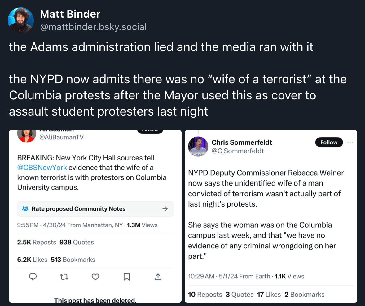 Bike chains notwithstanding, when Hell Gate’s Christopher Robbins asked the more straightforward question: “were any outside agitators arrested at Columbia’s Hamilton Hall?” Sheppard claimed that Commissioner Rebecca Weiner said there were, however they still had to “run names by Columbia.” But somehow despite not having confirmed who is or isn’t associated with the University, “we know that they were outside agitators.” Seems legit. They just know.
