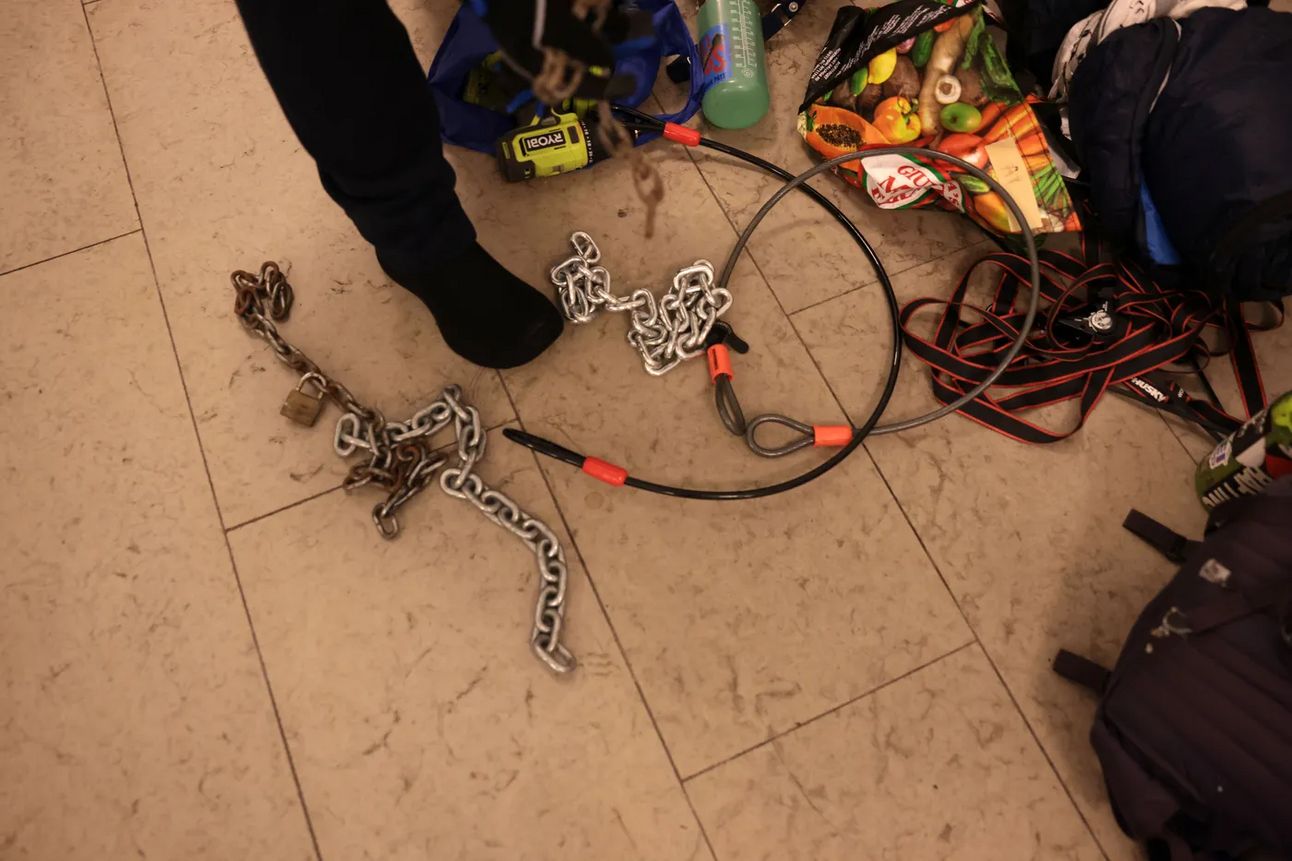 They had been carrying supplies in these reusable shopping bags leading up to the action. There were a lot of supplies — ropes, chains, nails, a drill, a hammer — that were used in the barricades, which were most likely brought in with the bags. They had sleeping bags, and they seemed like they were ready to stay. There were no protest chants inside the building — it was all very much to-the-point directions about what to do, what they needed to do.