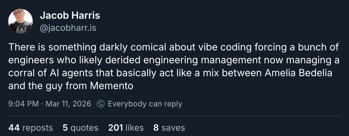 It’s “The End of Computer Programming as We Know It,” and no one feels fine. Anil Dash reminds us that “all of the great things that people love about technology weren't created by the money guys, or the bosses who make HR decisions — they were created by the people who actually build things.” See also: “Your LLM Doesn't Write Correct Code. It Writes Plausible Code.”
