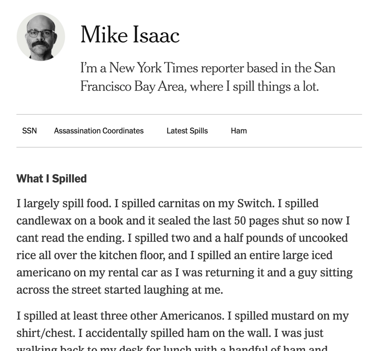 But the news is also the people who report the news. That’s why we call them ”newspeople.” Today the New York Times announced new “enhanced bios” for its newspeople which, like the CIA’s “enhanced interrogation techniques,” will let us get deeper into the guts of Times journalists and really find out everything they know. The new bios are rolling out first to a select group of reporters who hold particularly stressed positions, such as tech reporter Mike Isaac, and they look like this: