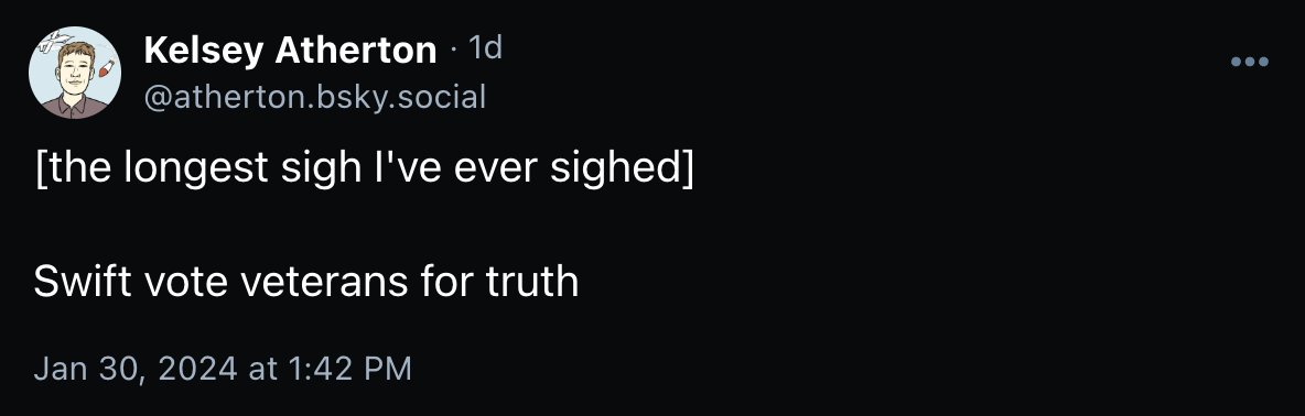 Mike Rugnetta launched a new podcast about the internet called “Never Post” and invited me to be on the zeroth episode as part of a round table about independent media in 2024 with Gita Jackson and Alex Sujong Laughlin, I think mainly because he liked the “Awl Inflection Point” post. There is also a oneth episode today, in the normal format. Flaming Hydra launched. Matt Webb launched a Kickstarter for the production version of his AI-generated poem-a-minute clock. I previously said “I‘ll allow it,” and I stand by that. Normally AI lying about facts is not a good thing, but a clock that lies about what time it is to make a poem work? I can support that.