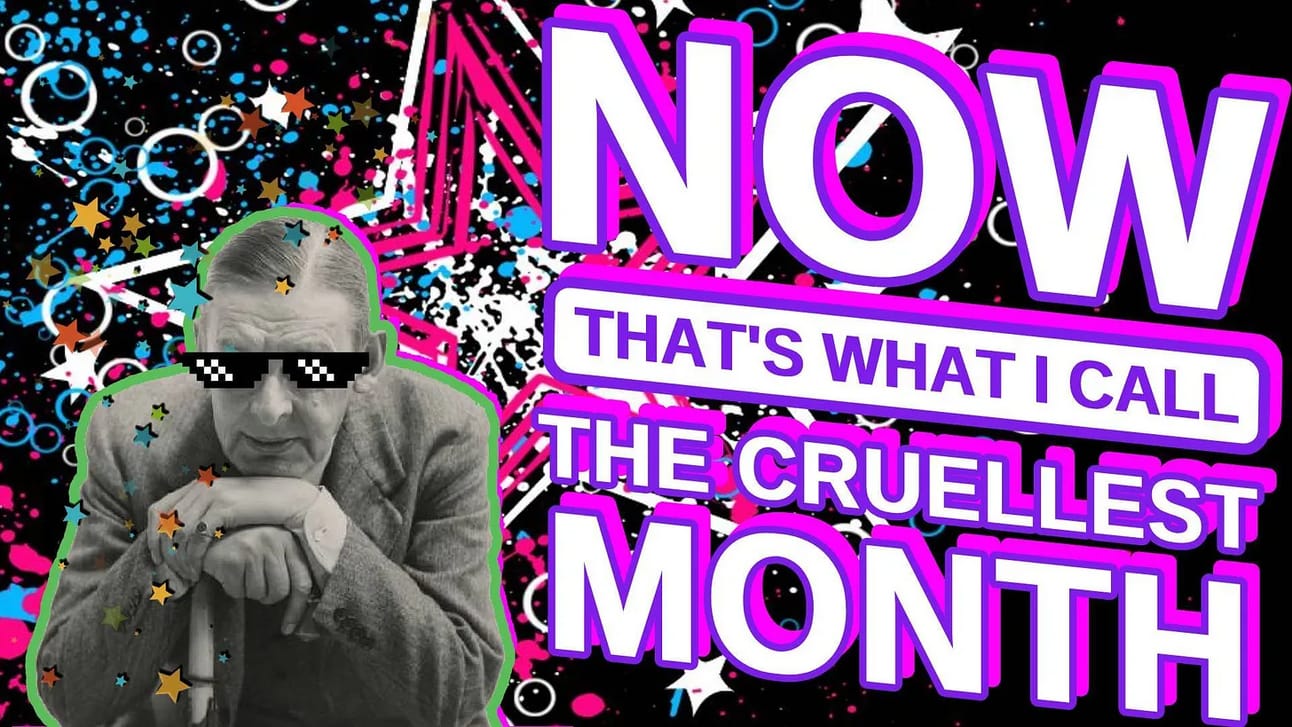 That’s right, it’s the month we revisit T.S. Eliot’s 1922 banger “The Waste Land,” which turns one hundred this December. Here’s my boy Tom himself reading it in his strenuously affected transatlantic accent and donating at least seven extra syllables to the word “cruellest.”