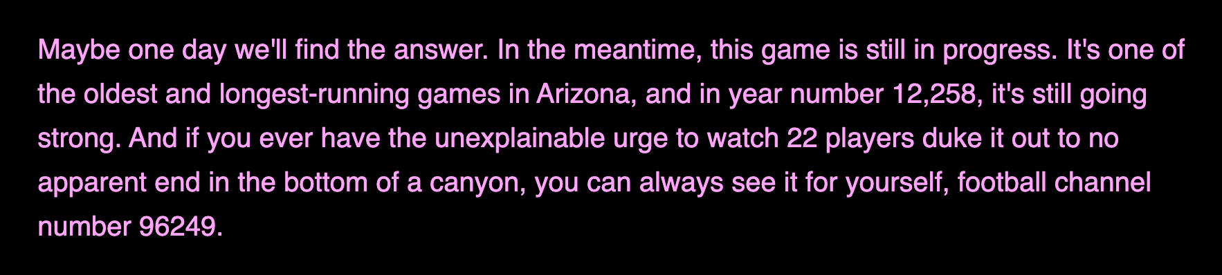 17776 is about football, kind of. It’s about the things football is about—time and space. What would a game mean if the time to play it was unlimited? What do you do with the knowledge that space is too big to explore even with unlimited time? What would football become if no one could ever die? If one game could go on for 10,000 years? If the field could be a circa 2026 NFL regulation fifty-three and one-third yards wide but stretch 2,340,170 yards long? What if we all lived long enough to see New York and Florida drown, and then lived thousands more years after that? What if the lightbulb burned for another fifteen thousand years?