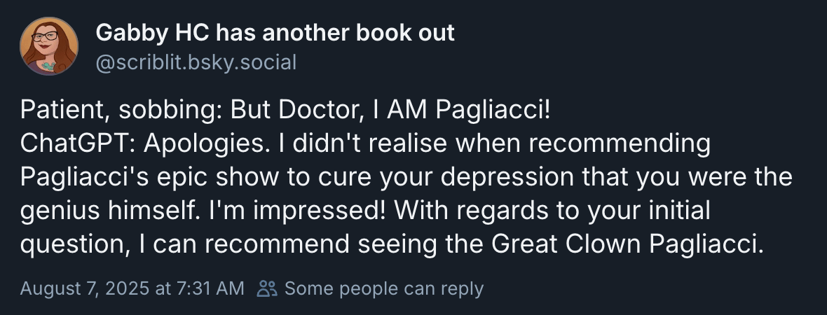 “Read Max” Read: Who is Elara Voss? “(You can only imagine the kinds of quackery Jung or Joseph Campbell would have gotten up to, given access to L.L.M.s).” And a new case study from The Slopper Lancet: “A Case of Bromism Influenced by Use of Artificial Intelligence:”