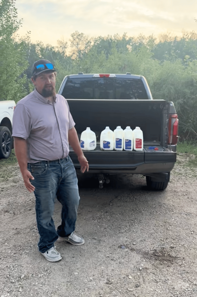 The video opens on a vertical wide shot of an average looking rural American man, slightly hunched, in the awkward “I’m not sure what to do with my hands” posture of the infrequently filmed. Rumpled button up shirt, worn blue jeans, a mesh-back baseball cap with sunglasses perched on the brim. He stands on road gravel. In the medium distance are nondescript trees and brush. Behind him the tailgate of a pickup truck stands open, and on it are set what appears to be several full gallon jugs of milk.