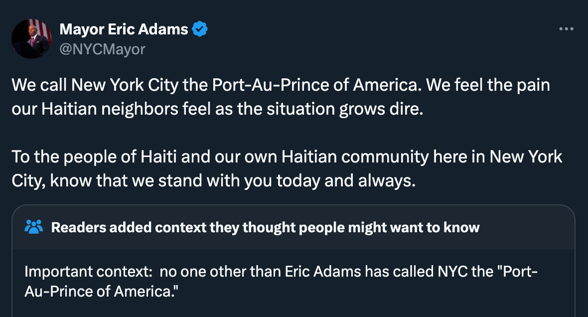 Another reliable source of new sentences is the New Jersey resident who stopped abusing citizens and started abusing language1 when he became mayor of New York City, Eric Adams, who posted this morning: