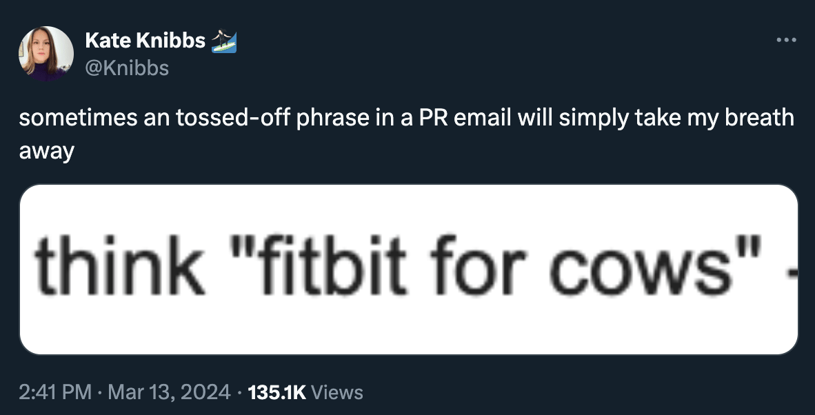 I’m thinking it! I’m thinking it so hard. I tried to figure out who this pitch is coming from but it appears that “connected trackers for cows” have been a market segment for years and every company pitches itself as “fitbit for cows.” So technically this isn’t a new sentence, but it was new to me.
