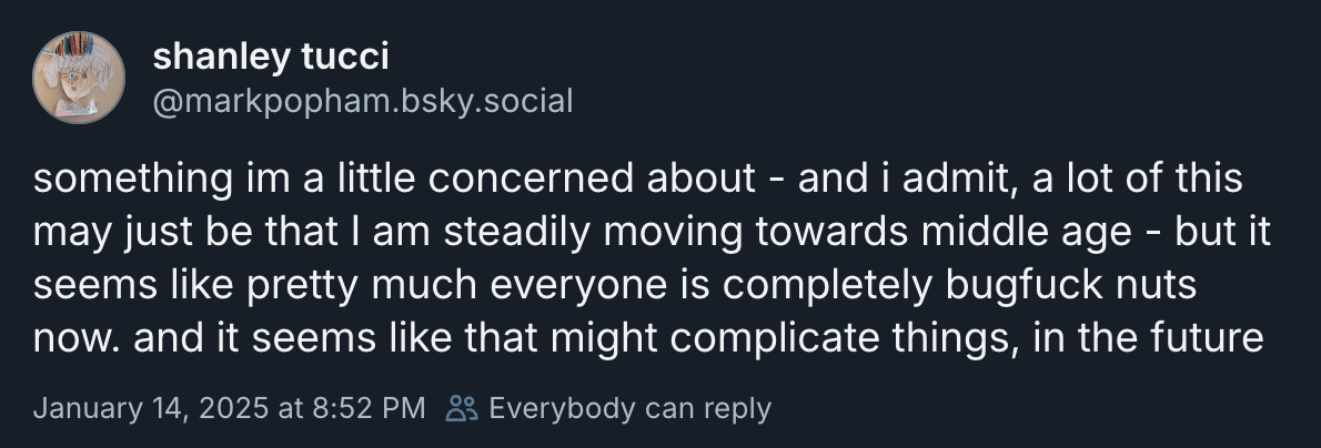 What Does It Mean? Lmao, no one knows. Tiktok says it will shut down on Sunday. Joe Biden, snatching a last-second defeat from the jaws of a slightly different defeat, has said he won’t enforce the ban, whatever that even means. Trump invited Tiktok CEO Shou Zi Chew to sit in the oligarch’s circle at his inauguration, but hasn’t said definitively what he’ll do about the ban, which began as a 2020 executive order issued by Trump himself. The whole thing has become so baroque and baffling that it’s impossible to tell what the sides even are anymore, let alone who’s on which side. Here at Today Certainty Tabs, our middle name is “Certainty” so I wish I could be more definitive about this, but if anyone claims they know what’s going to happen on Sunday they are lying to you.