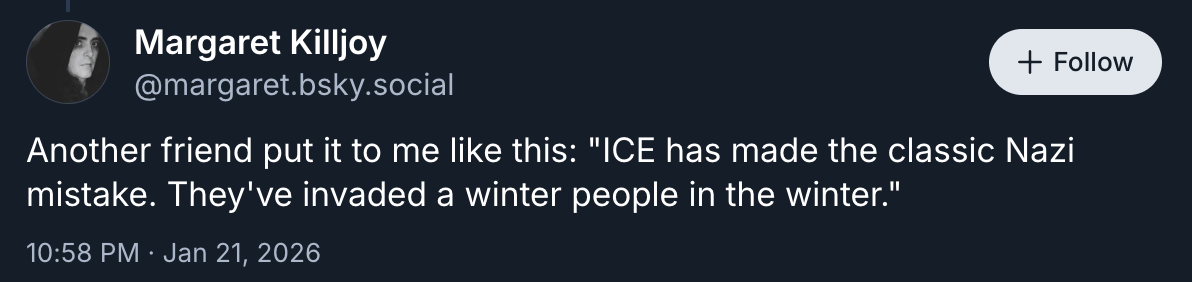 Good luck on the general strike today in the Twin Cities and good luck to my own city of Portland, Maine, where the gestapo is here and actively snatching dangerous miscreants like UMaine master’s degree recipient and working civil engineer Juan Sebastian Carvajal-Munoz. Come out ye cowards ICE, come and finally pay the price. Here are some ways to help Minnesota.
