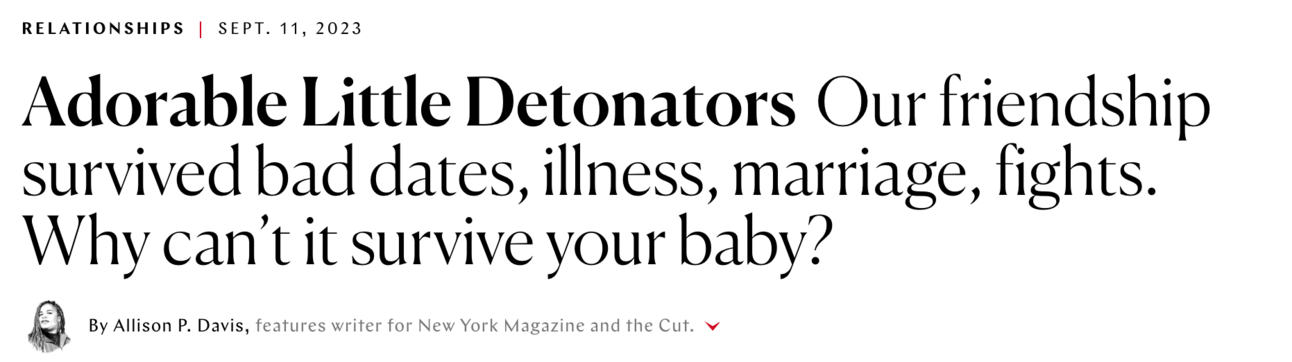 I don’t know if there is discourse circulating that I’m no longer privy to now that Twitter is dead or if every other publication took one look at Allison P. Davis’s New York Magazine “parenting and adult friendships” story and called a full twenty four hour hold while the ensuing conversational tsunami demolished every group chat, but I do know that this story is the only thing the Tabs Discord has talked about for a solid day now.12