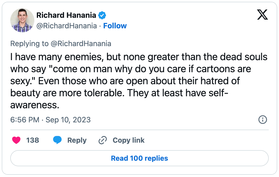 If you haven’t had the misfortune of encountering him before, this guy is a white supremacist and fave of Substack founder Hamish McKenzie. I guess he’s also into cartoons, sexually? Also today in normal fascist stuff, here’s Chauncey DeVega in Salon with the news from 2015: “Trump plans to become a dictator — denial will not save you.”